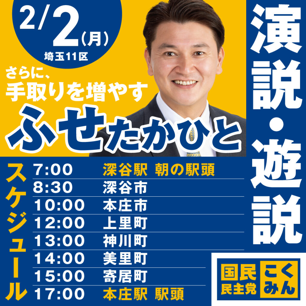 2026/02/02 2月2日(月) 演説・遊説スケジュール スケジュールは下記の通りとなっておりますので、ぜひお越しください。 7:00 深谷駅 朝の駅頭8:30 深谷市10:00 本庄市12:00 上里町13:00 神川町14:00 美里町15:00 寄居町17:00 本庄駅 駅頭 よろしくお願いいたします! トップページへ お知らせ一覧へ