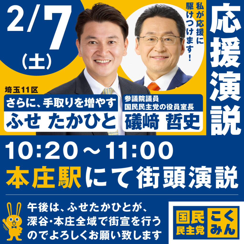 10:20~11:00、本庄駅にて街頭演説を行います!